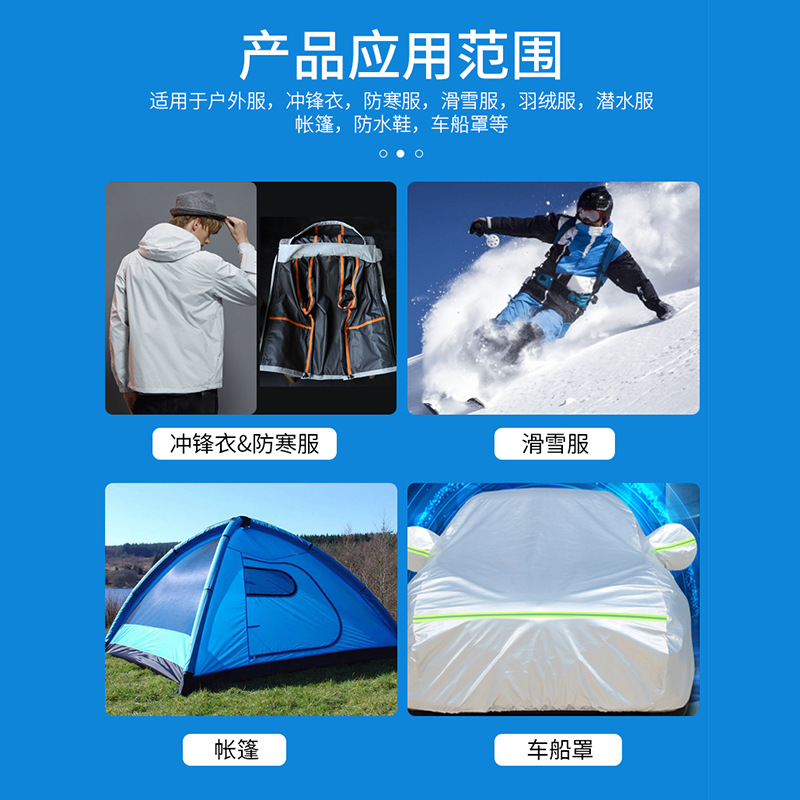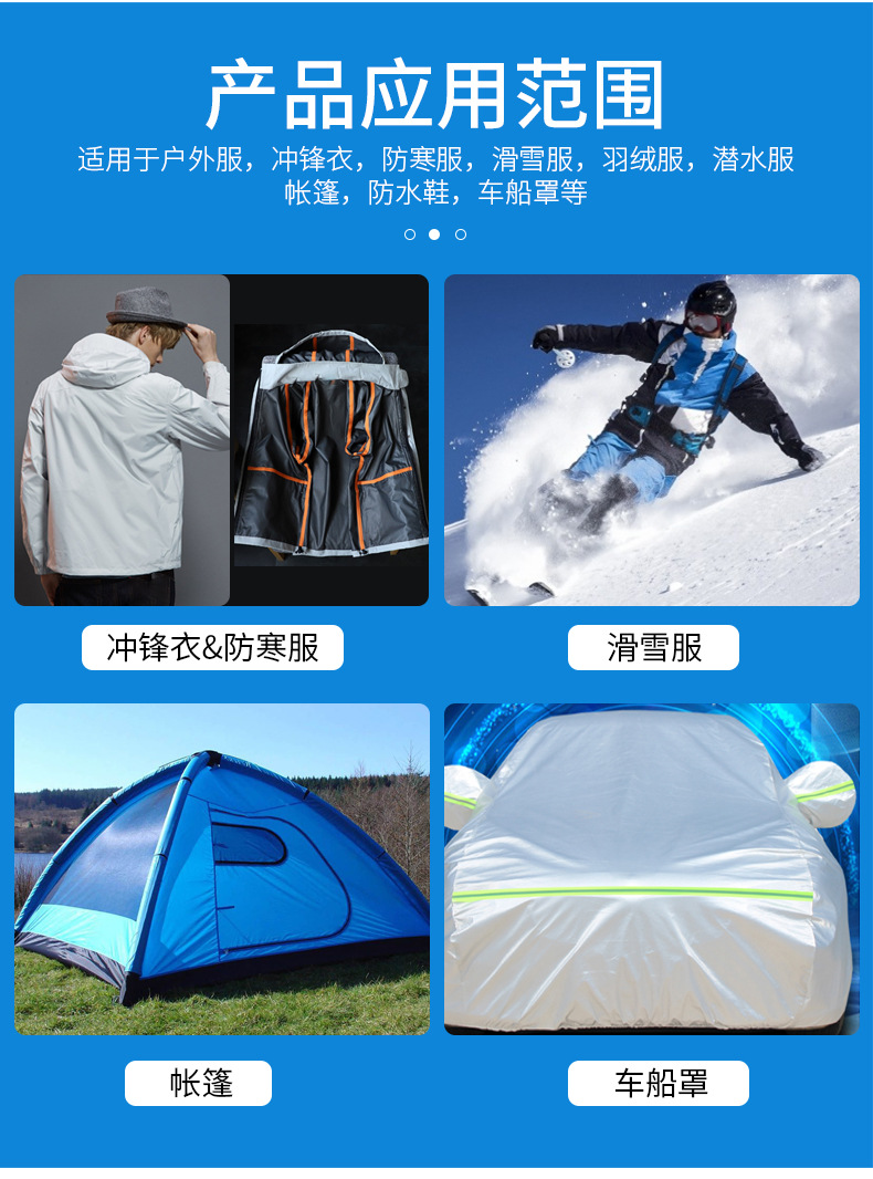 ● 户外服,冲锋衣,防寒服,滑雪服,羽绒服,潜水服,帐篷,防水鞋,车船罩等。